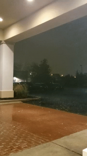 A powerful lightning and rainstorm illuminates a dark parking lot at night.