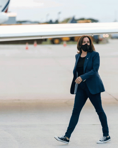 Kamala Harris confidently walks across an airport tarmac in a suit and sneakers, embodying a 'boss' attitude.