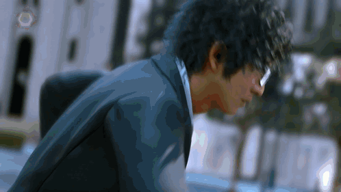 a man in a suit and glasses is looking down at something