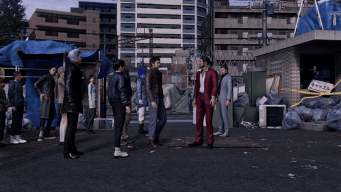 a man in a red suit stands in a line with other men