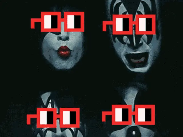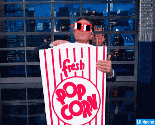 Stephen Colbert, wearing Lil Nouns Noggles, humorously holds a giant popcorn box and eats popcorn on a late-night show set.