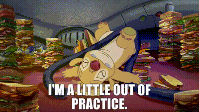 Reuben (Experiment 625) from Lilo & Stitch tangled in a hose amidst sandwiches, saying 'I'm a little out of practice.'