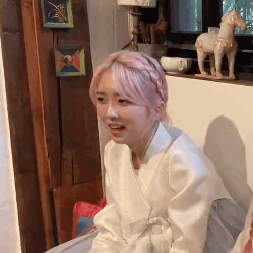 a girl with pink hair is sitting on a couch with a statue of a horse in the background .