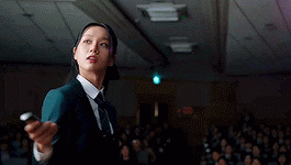 a woman is holding a gun in front of a crowd of people .