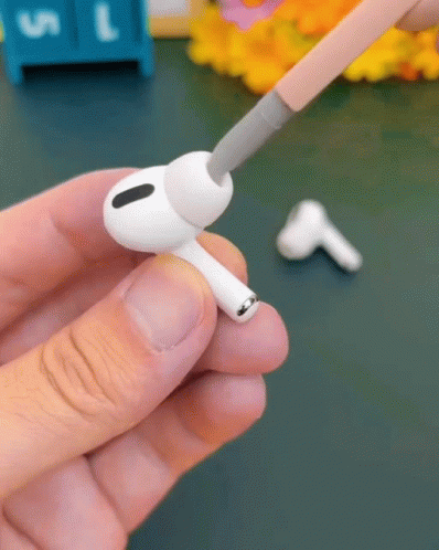A person demonstrates a multi-functional cleaning tool for earbuds and phone screens, featuring a pen, spray, and brush.