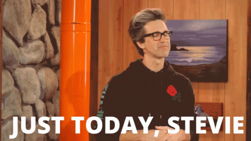 Link Neal, wearing glasses and a black hoodie, stands in front of a wall with the text 'JUST TODAY, STEVIE' displayed.