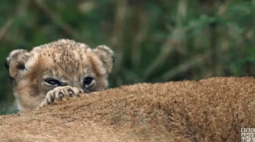 An adorable lion cub with spotted fur rests its head and paws, looking sleepy and content.