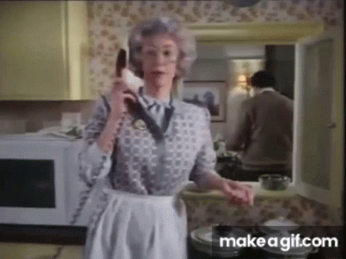 Maureen Lipman, known for her role as Beattie in BT Ads, talks on a corded telephone in a kitchen setting.