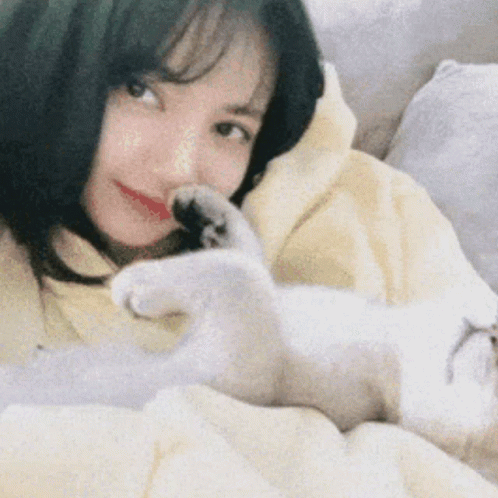 Lisa, identified from the tags, is seen cuddling and kissing her cat on a cozy bed.