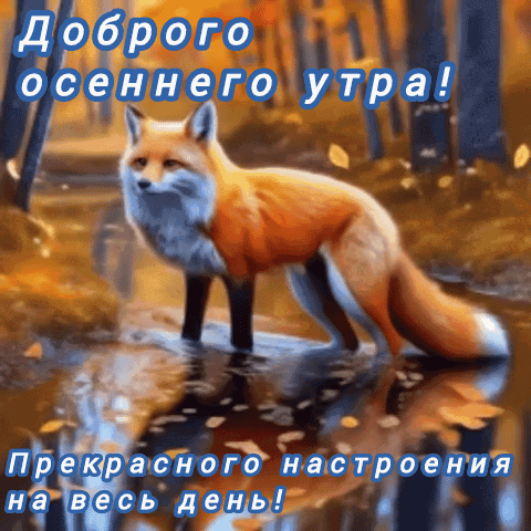 A fox walks through an autumn forest stream, wishing a good autumn morning and a great mood for the day.