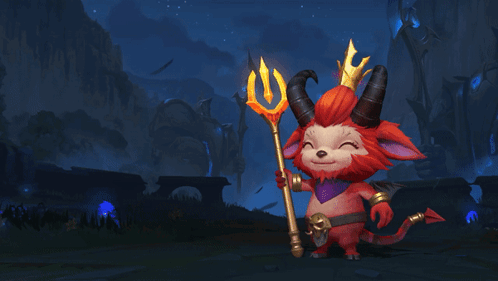Little Devil Teemo, a mischievous red demon character with horns and a trident, smiles and jumps playfully.