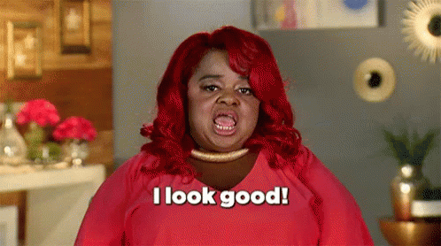 A confident woman from Little Women with vibrant red hair, wearing a red top, proudly declares 'I look good!' to the camera.