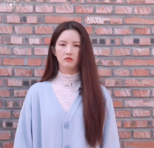 Liu Xiening stands in front of a brick wall, wearing a blue cardigan, displaying a helpless expression.