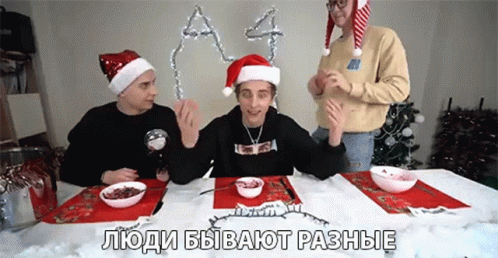 A4 and two friends, all wearing Santa hats, sit at a festive table with bowls of food, celebrating Christmas.