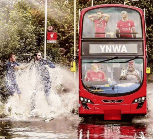 Liverpool FC double-decker bus with 'YNWA' splashes Chelsea players in a puddle, celebrating Premier League championship.
