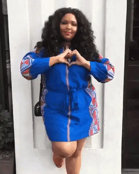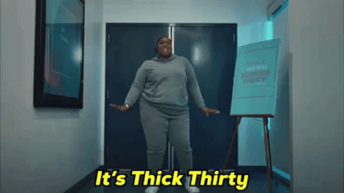 Lizzo dancing energetically in a hallway, arms outstretched, declaring "It's Thick Thirty."
