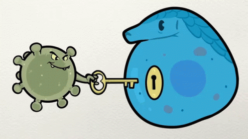 A cartoon virus attempts to unlock a blue creature with a key, illustrating a concept from Curiosamente.