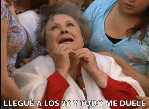 Actress Evita Muñoz 'Chachita' cries dramatically, embodying the meme 'I reached 30 and everything hurts me'.