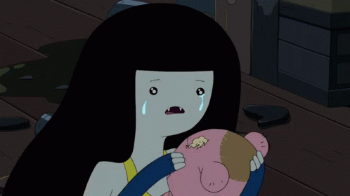 Marceline from Adventure Time cries while holding her beloved pink teddy bear, Hambo, in a sad moment.