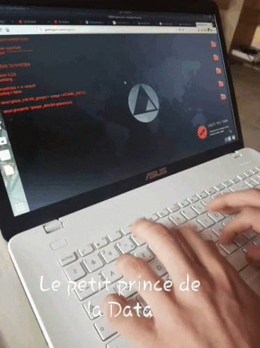 A person types on an ASUS laptop, with 'Le petit prince de la Data' displayed, then looks up and smiles.