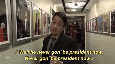 LMM sings 'Well he never gon' be president now' in a hallway lined with framed pictures.