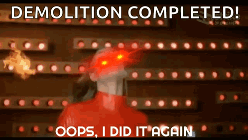 Britney Spears with glowing red eyes in her iconic red jumpsuit, declaring 'Demolition Completed! Oops, I Did It Again'.