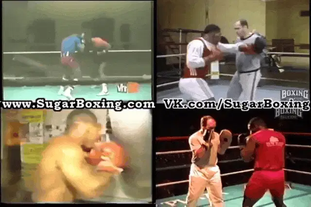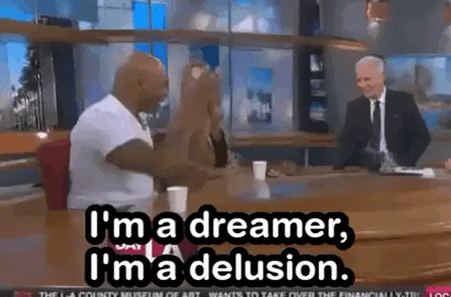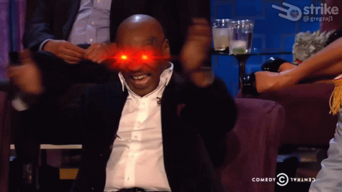 Mike Tyson laughs hysterically with glowing red laser eyes in a studio setting, clapping his hands.