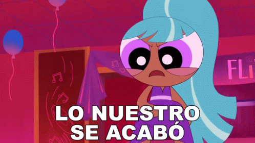 A Powerpuff Girl character with blue hair looks upset, with the Spanish phrase 'Lo Nuestro Se Acabó' (We are over) displayed.