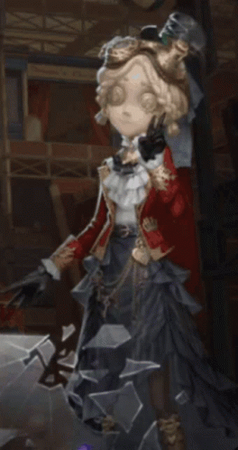 Lockheart (Tracy Reznik) from Identity V makes a peace sign, dressed in her signature red jacket and ruffled skirt.