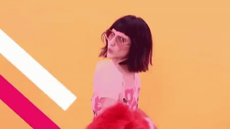 Lodovica Comello dancing energetically in sunglasses and a pink shirt against a vibrant yellow background.