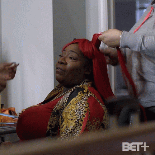 Delrhonda Hood, also known as Big Fifty, laughing joyfully while getting her hair braided.