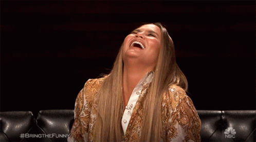 Chrissy Teigen laughing hysterically on a couch during 'Bring The Funny' on NBC.