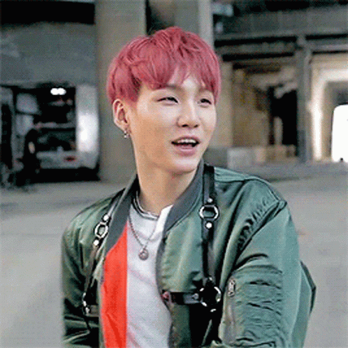 A young man with vibrant pink hair smiles and laughs, wearing a green bomber jacket with black straps.