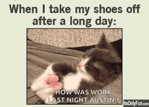 A sleepy kitten stretches and relaxes, perfectly capturing the feeling of taking shoes off after a long day, with a humorous caption.