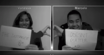 Vanessa and Marcelo share a sweet moment, holding signs that read 'The distance doesn't matter' and forming a heart.