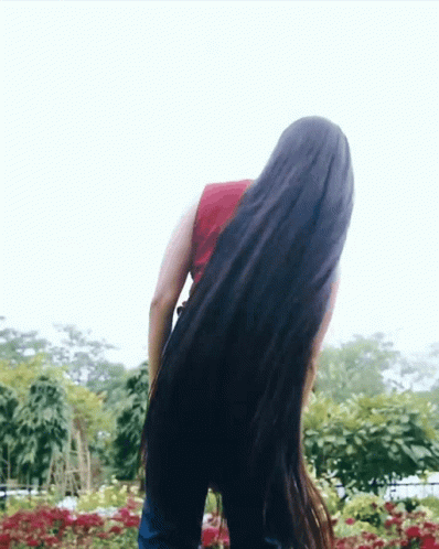 A beautiful woman with incredibly long, flowing black hair poses gracefully in a vibrant garden setting.