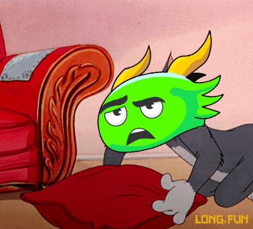 Long Long Zksync character, a green-faced dragon on a cat's body, looking tired and annoyed.