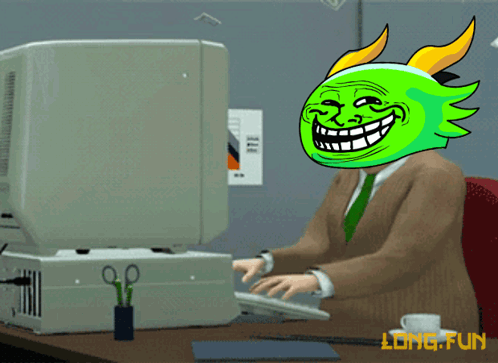 A troll-faced character, known as Long Zksync Long Dragon, types on a computer as money falls around him.