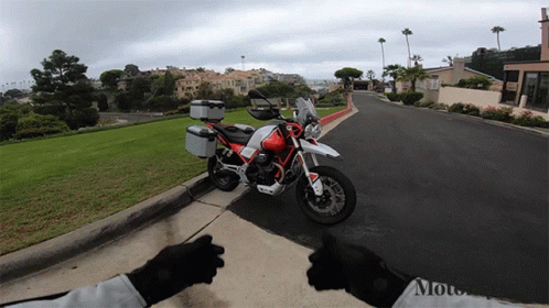 A motorcyclist proudly presents their red and white Moto Guzzi V85TT adventure motorcycle.