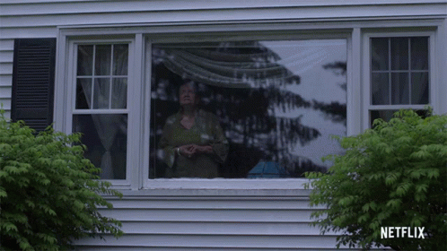 A woman looks out a large window from inside a house, with the Netflix logo visible. From Unsolved Mysteries.