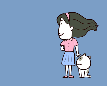 An animated woman with a dog gives a thumbs-up gesture, looking away, with a speech bubble saying 'Like it!'.