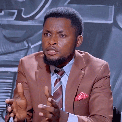 Mark Angel, the host, looks intently, gesturing with his hands in a brown suit, conveying confusion.