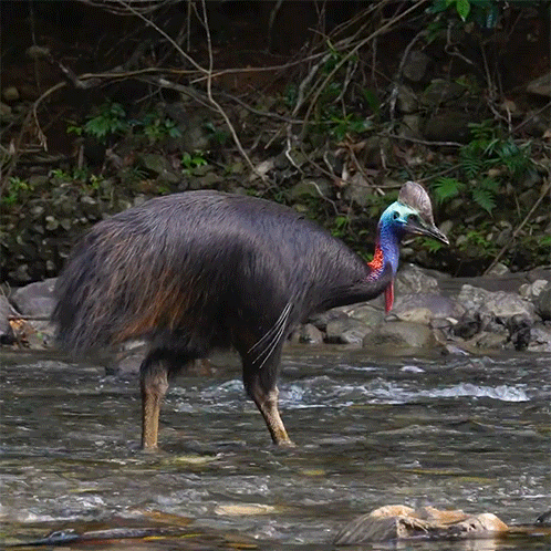 A majestic cassowary, a large flightless bird, wades through a shallow river, searching for food.