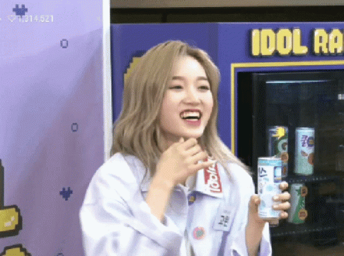 Loona's Go Won smiles and waves on Idol Radio, holding a drink and making a 'call me' gesture.
