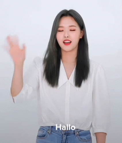 Loona's Olivia Hye waves and says 'Hallo' while wearing a white shirt and blue jeans.
