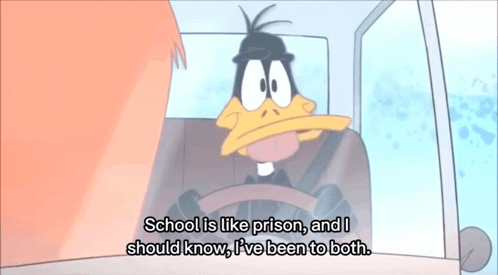 Daffy Duck from The Looney Tunes Show drives a car and shares his cynical view on school.