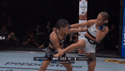 two women are fighting in a cage with the ufc logo on the side