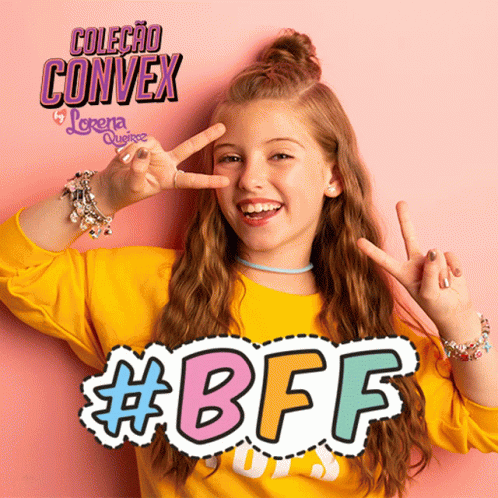 Lorena Queiroz poses for Convex Brasil, smiling and giving peace signs in a vibrant yellow sweatshirt.