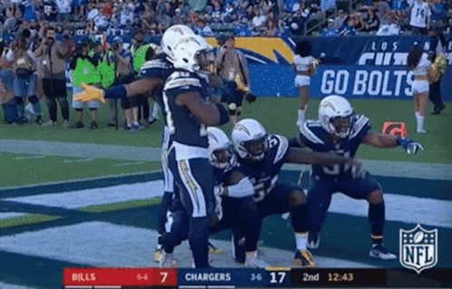 The Los Angeles Chargers football team celebrates a touchdown during an NFL game against the Bills.
