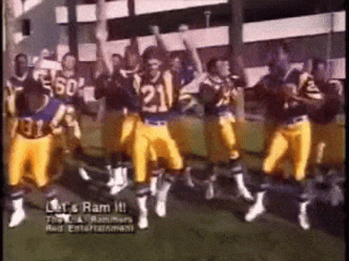 Los Angeles Rams football players dance on the field with 'Let's Ram It!' text displayed.